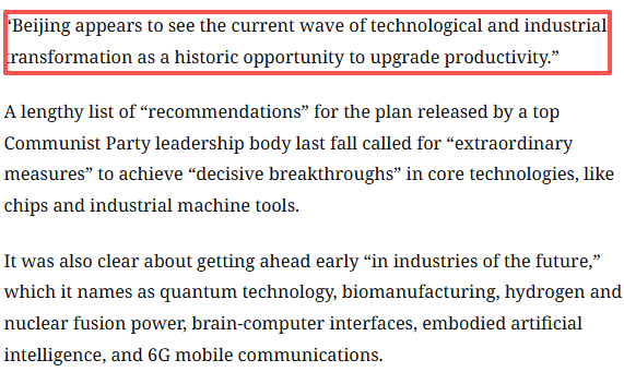 路透社报道称,中国“十五五”规划纲要草案立意高远,将积极发展人工智能,力争在量子计算、人形机器人等新兴技术领域占据领先地位。政府工作报告中,人工智能被提及超过 50 次,全面实施 “人工智能 +” 行动计划,强调抢占科技发展制高点、实现关键核心技术决战突破。报告开篇突出新质生产力,相关部署重视程度较往年显著提升。报道认为,中国在人工智能、生物医药、机器人、量子技术等领域已跻身世界前列。